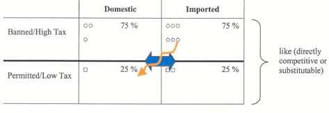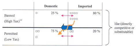 The asymmetric factual matrix of the first table reflects a situation of de facto discrimination against imports under both asymmetry and diagonal approaches. Most of the goods, which are or could be imported and fall within the group of like products, face the less advantageous regulatory treatment. Simultaneously, most like domestic products receive the more favorable of the two available treatments. A comparison of the two entire groups of like products, domestic and imported, along the lines of the thick arrow demonstrates the imbalance or asymmetry. One would obviously also find that some of the imports receive less favorable treatment than some like domestic products by comparing the diagonally opposite sub-categories along the lines of the wavy arrow (diagonal approach).